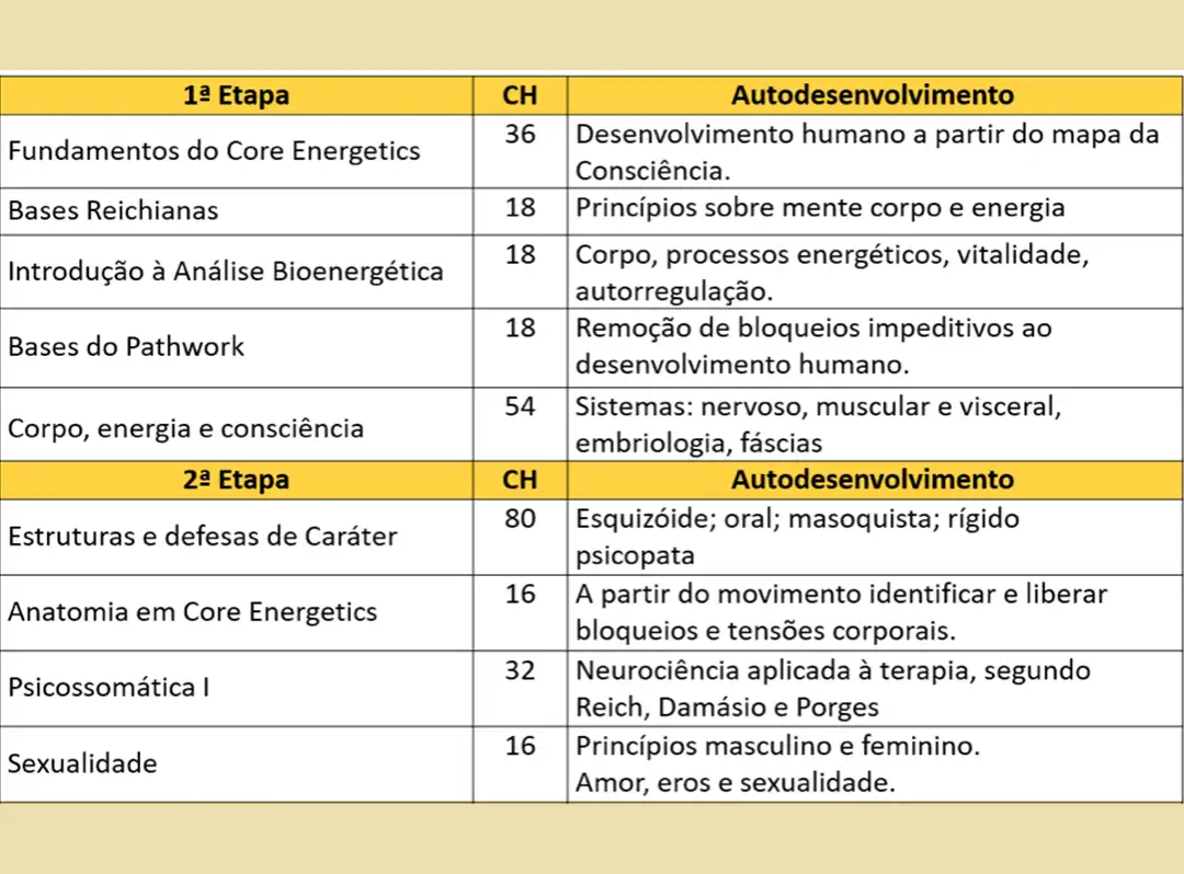 • 100% de estágio supervisionado para terapeuta em Core Energetics.