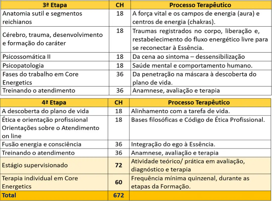 3ª Competência em Metodologia Aplicada: fornece o treinamento para a aplicação e prática com responsabilidade da terapia Core Energetics, promovendo a integração energética, abertura do coração e mente, e a instrumentalização na expressão do Eu Superior no cotidiano do seu plano de vida.